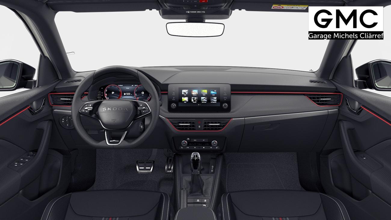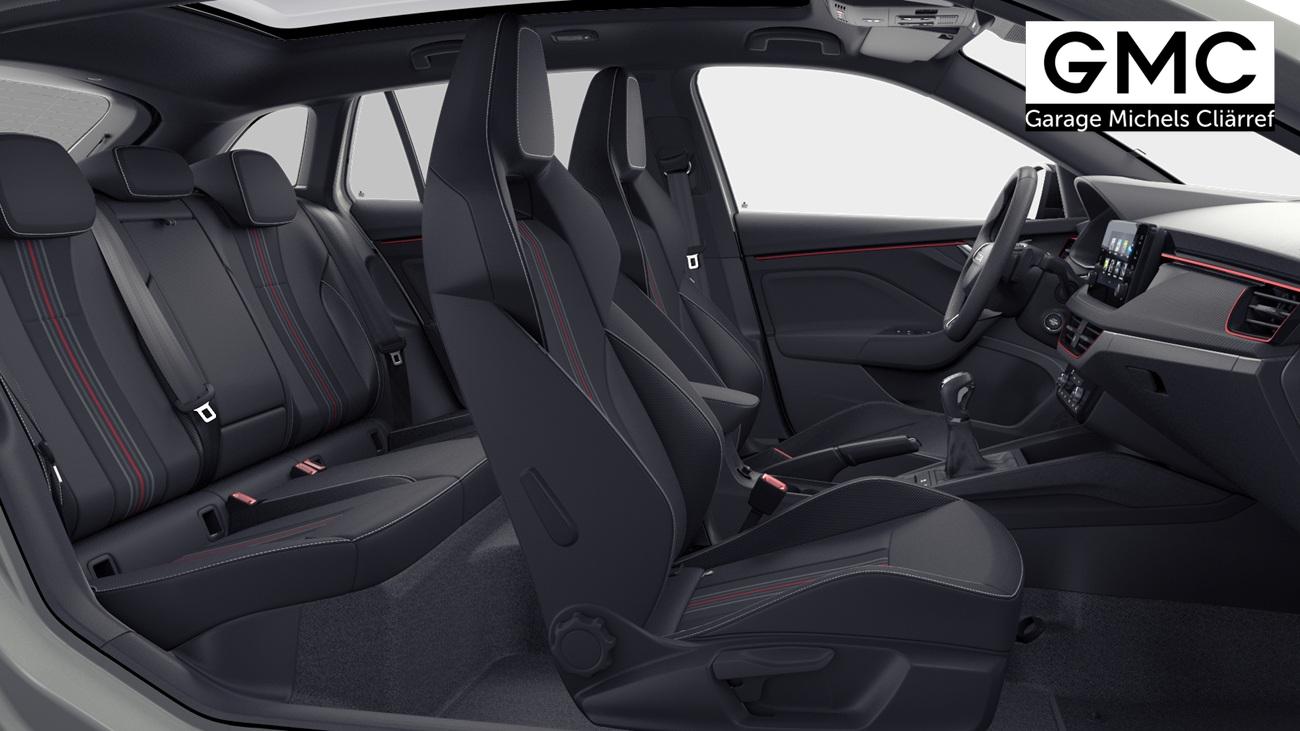 Innenausstattung Design Selection MONTE CARLO, Stoff in Schwarz und Rot, Sportsitze vorn mit integrierter Kopfstütze, Dekor Monte Carlo Carbon, Interieurleisten und Luftausströmerumrandung in Schwarz glänzend mit Kontrastline in Rot, LED-Ambientebeleuchtung (2-farbig, weiß oder rot), Mittelarmlehne hinten, Türeinstiegsleisten, Pedalerie in Edelstahl-Optik